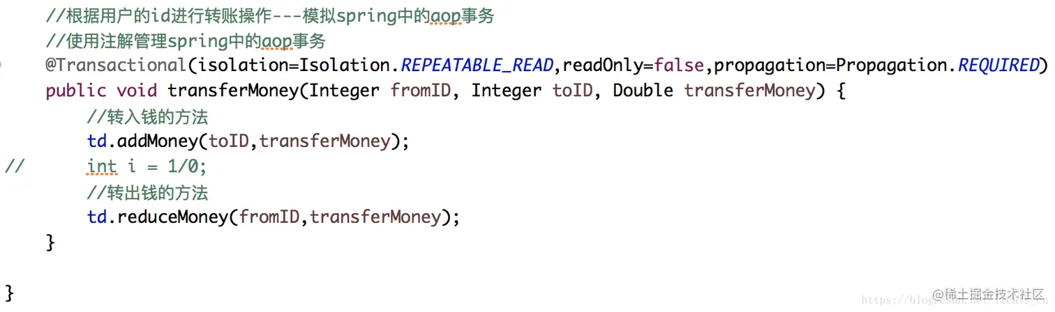 【粗粒度的事务控制: 只能给整个方法应用事务,不可以对方法的某几行应用事务。】