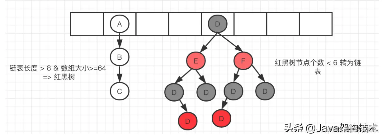 - 当数组的某一个索引位置上的元素以链表形式存在的数据个数 > 8 且当前数组的长度 > 64时,此时此索引位置上的所数据改为使用红黑树存储。