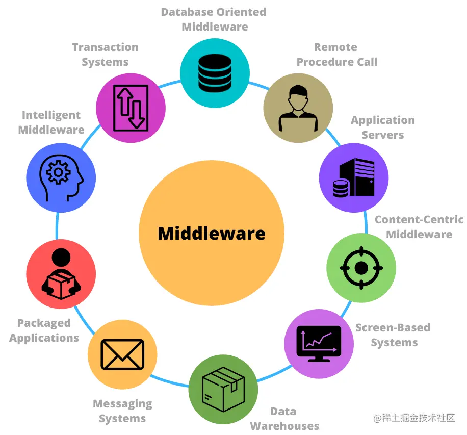 中间件是指在分布式计算环境中,位于应用程序和操作系统之间的软件层。它是一个支持应用程序开发和部署的平台,提供了一组API和工具,使得不同的应用程序和系统之间可以相互通信、协作和交换数据。