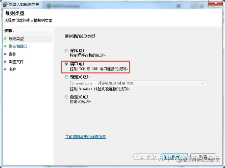 3、规则类型点击端口,选择下一步