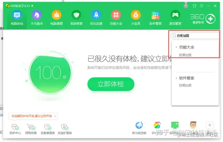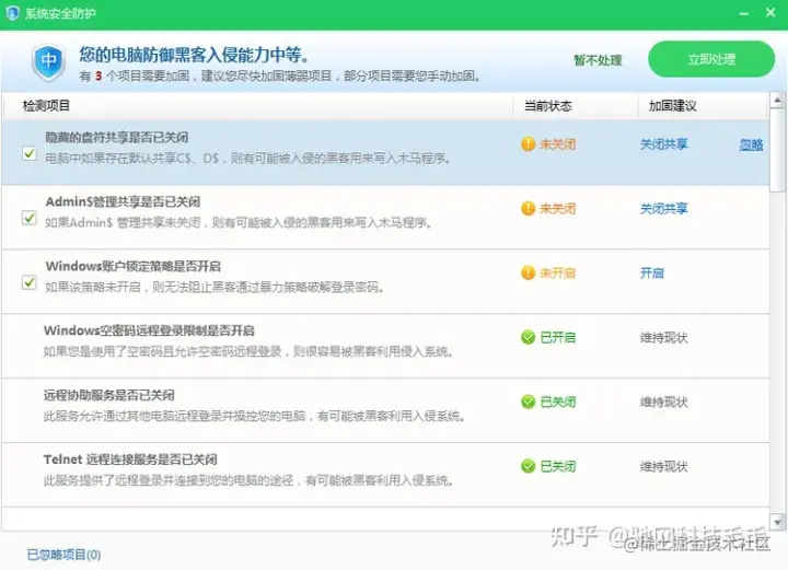 5、点击进入下一步,点击完成至此即完成了对445端口的关闭,同样其他端口也可以使用相同的方法禁用方案四:使用360安全卫士“防黑加固”关闭文件共享、admin$管理共享、远程服务等1、打开360安全卫士右上方搜索“防黑加固”打开此工具