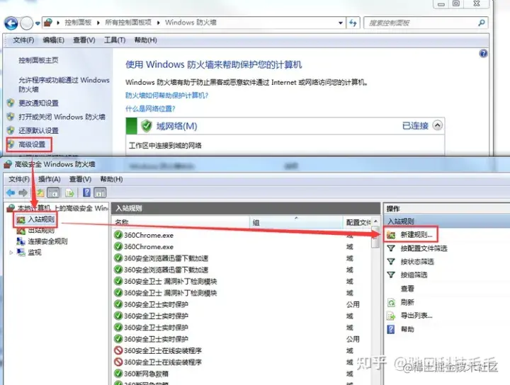 2、在Windows防火墙中点击“高级设置”,点击左上角“入站规则”,然后再选右上角新建规则