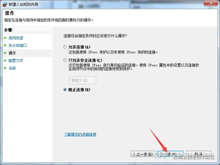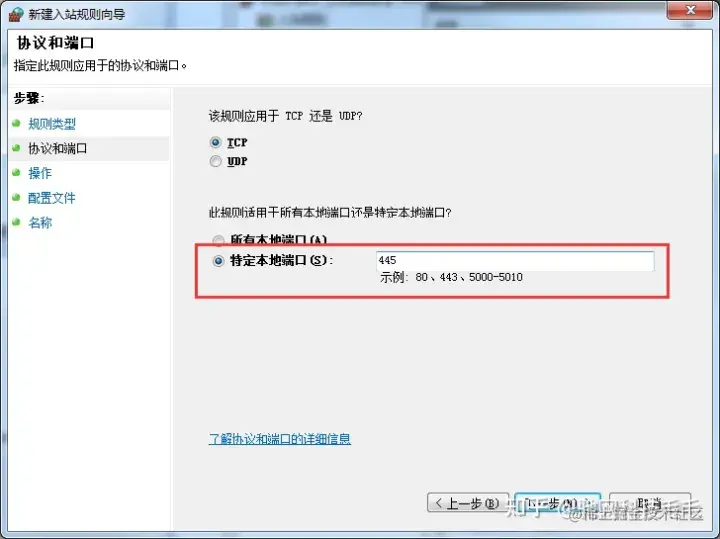 4、在“特定本地端口”中输入“445”,点击进入下一步, 然后在操作中选择“阻止连接”,点击进入下一步