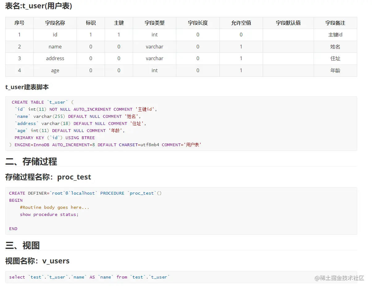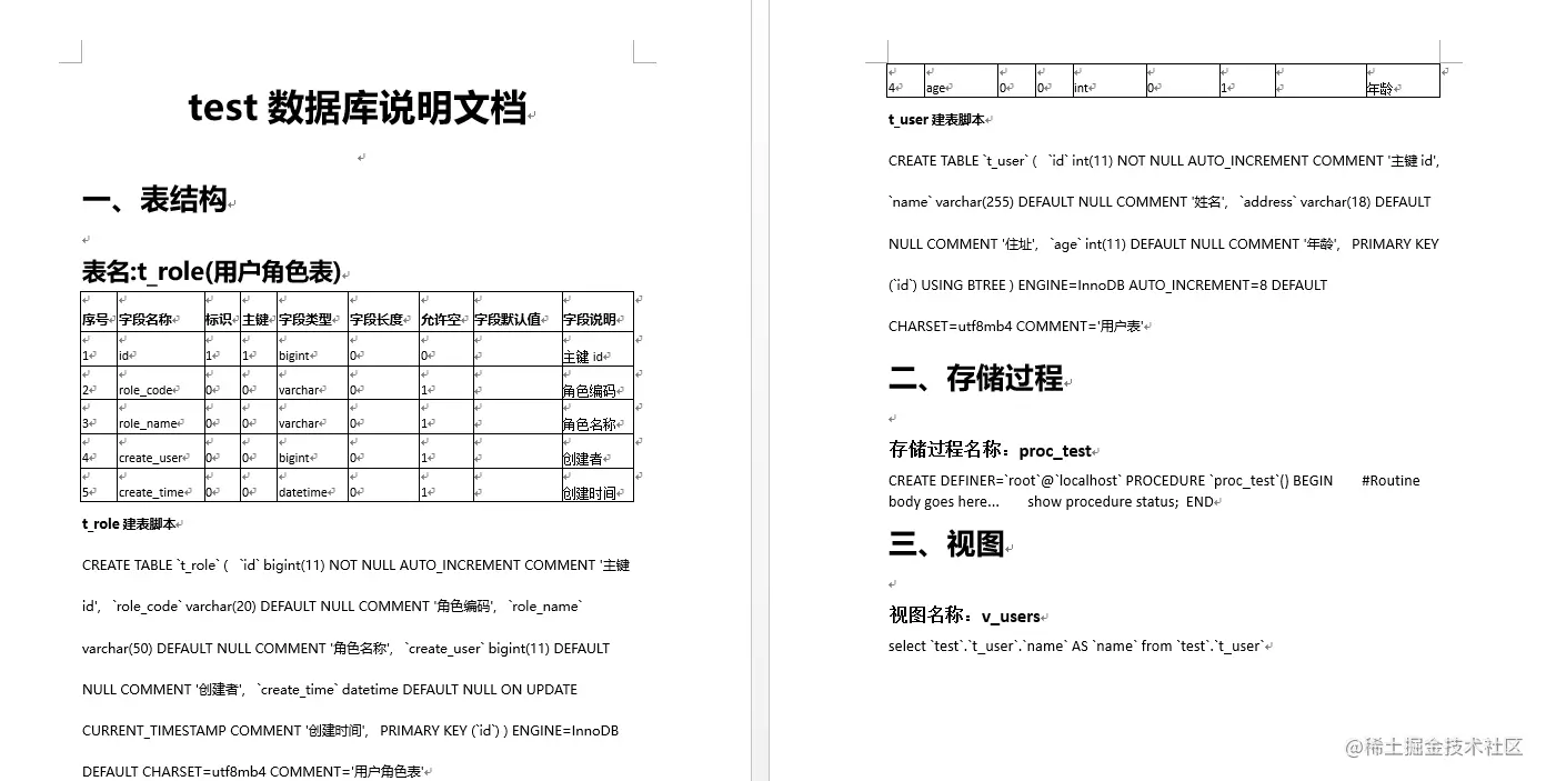 - 导出内容包含数据表(字段详情、字段注释、长度、默认值等)、创建表脚本、视图及视图脚本、存储过程及脚本