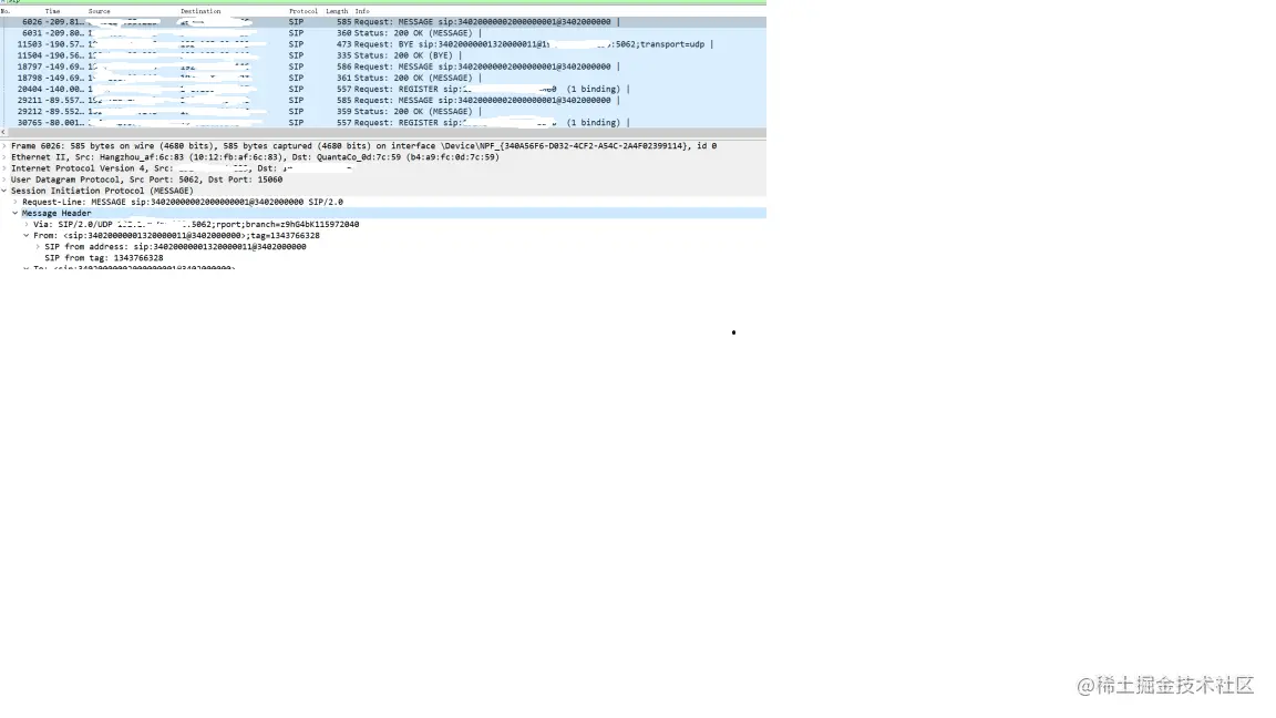2)使用Wireshark抓包获取SIP协议数据包分析。SIP协议即会话初始协议,是一个应用层的点对点协议,用于初始、管理和终止网络中的语音和视频会话,是国标GB28181协议的核心之一。通过数据包分析,设备与平台已经成功建立握手,并且无丢包情况。根据上述判断无法播放的原因大概率是端口问题;