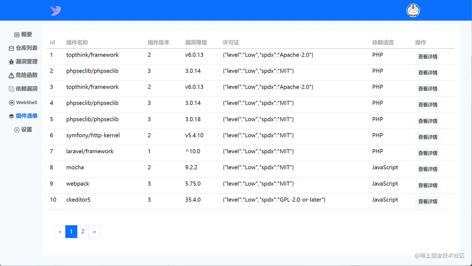 最后是依赖组件列表,会将项目所依赖的组件都解析出来,但这些信息只是辅助,并不是说这些组件都存在安全问题.