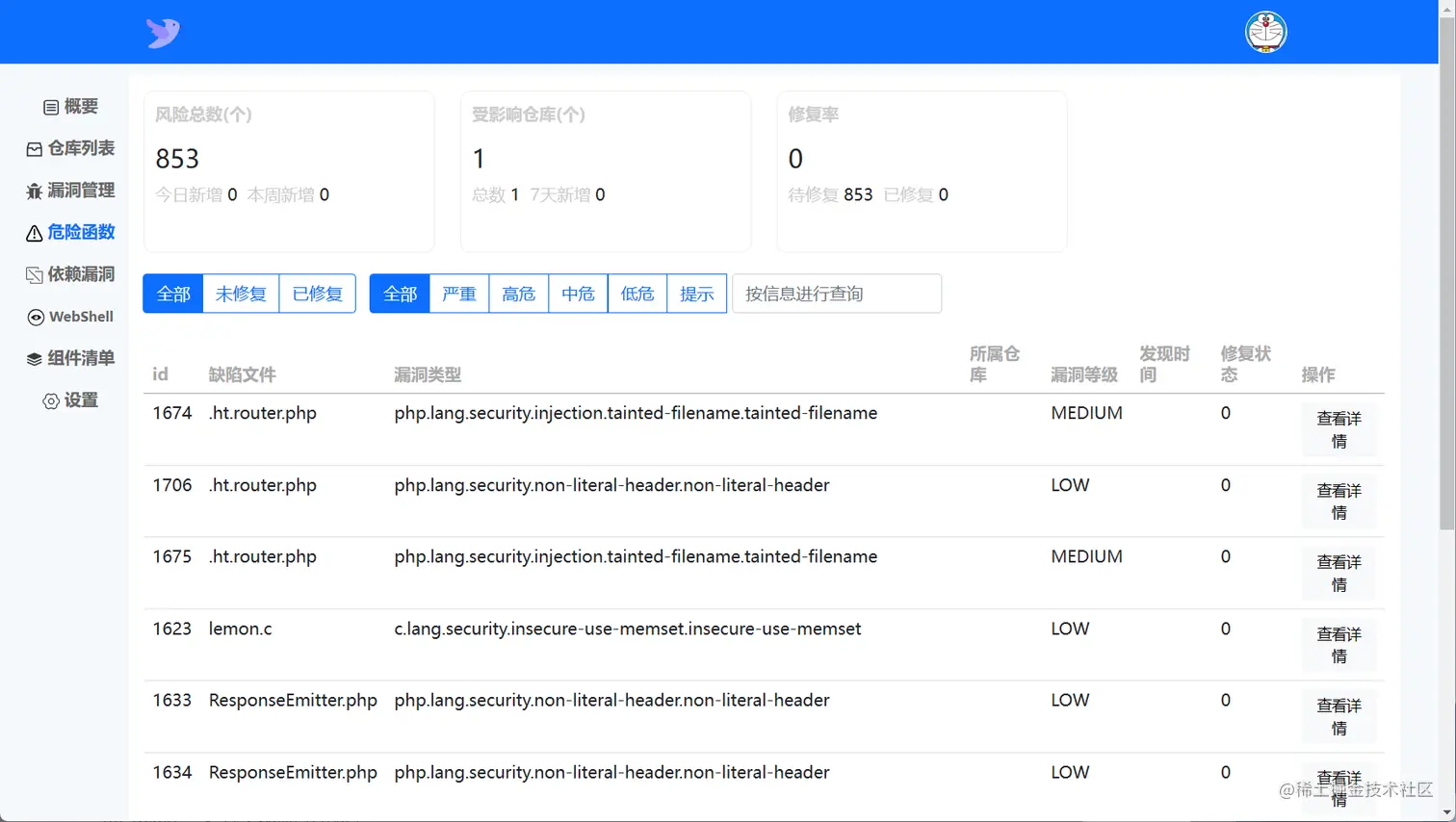 危险函数其实是通过semgrep实现的危险规则检测,比如当调用一些敏感函数,会在这里出现;当然出现的其实也不仅仅是危险的函数,可能还会有一些其他的规则