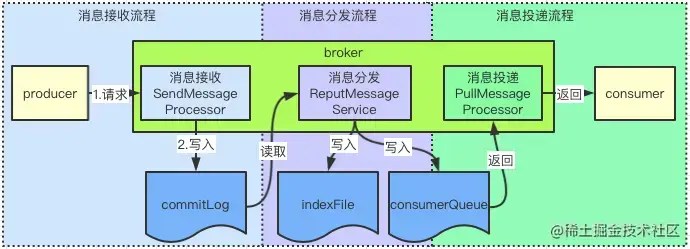 producer的消息,处理类是SendMessageProcessor,将消息写入到commigLog文件后,接收流程处理完毕; - 消息分发: