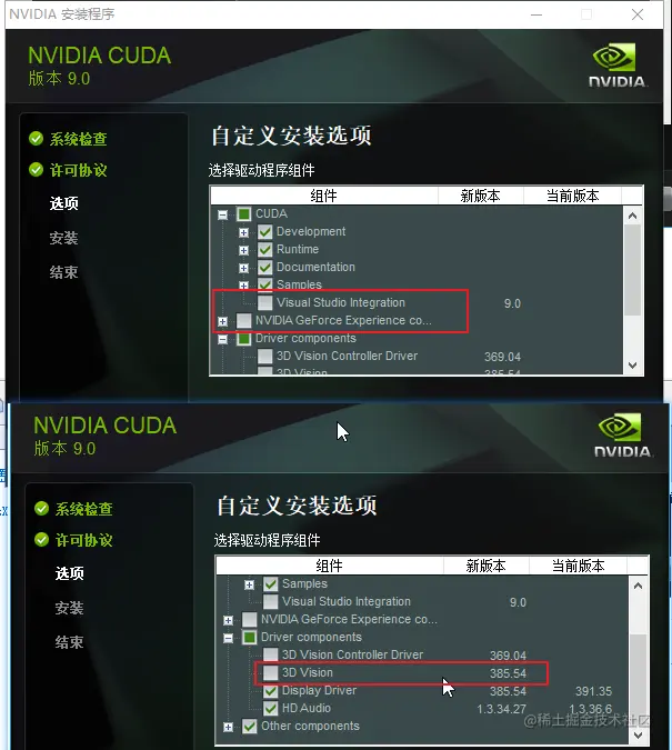 如上图显示我的显卡驱动程序版本 391.25,大于 CUDA 的 Display Driver 385.54,所以选择关闭,如果小于就要勾选。