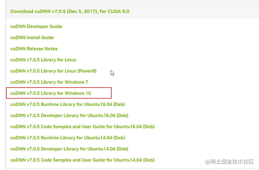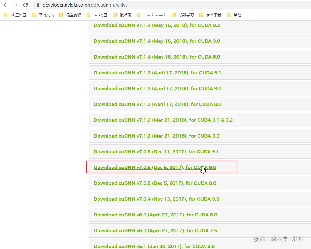 在下载 CUDNN 前,需要注册英伟达账户,通过邮件验证通过后,就按下面图片方式选择下载了。
