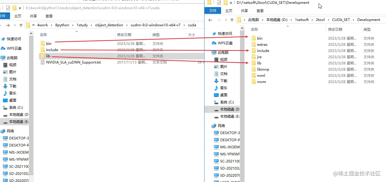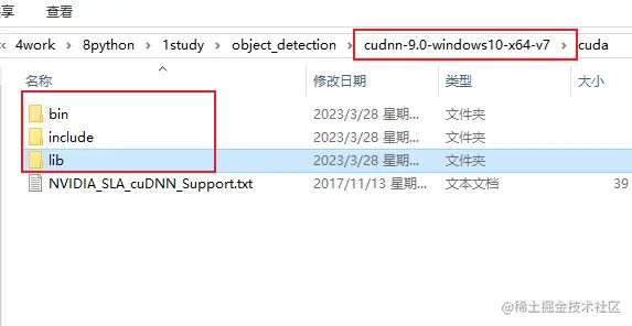 这里就需要找到 CUDA 安装的位置,如果不记得位置,可以在前面环境变量中找到。最后只需要将 CUDNN 里的文件放入 CUDA 对应的目录中即可。