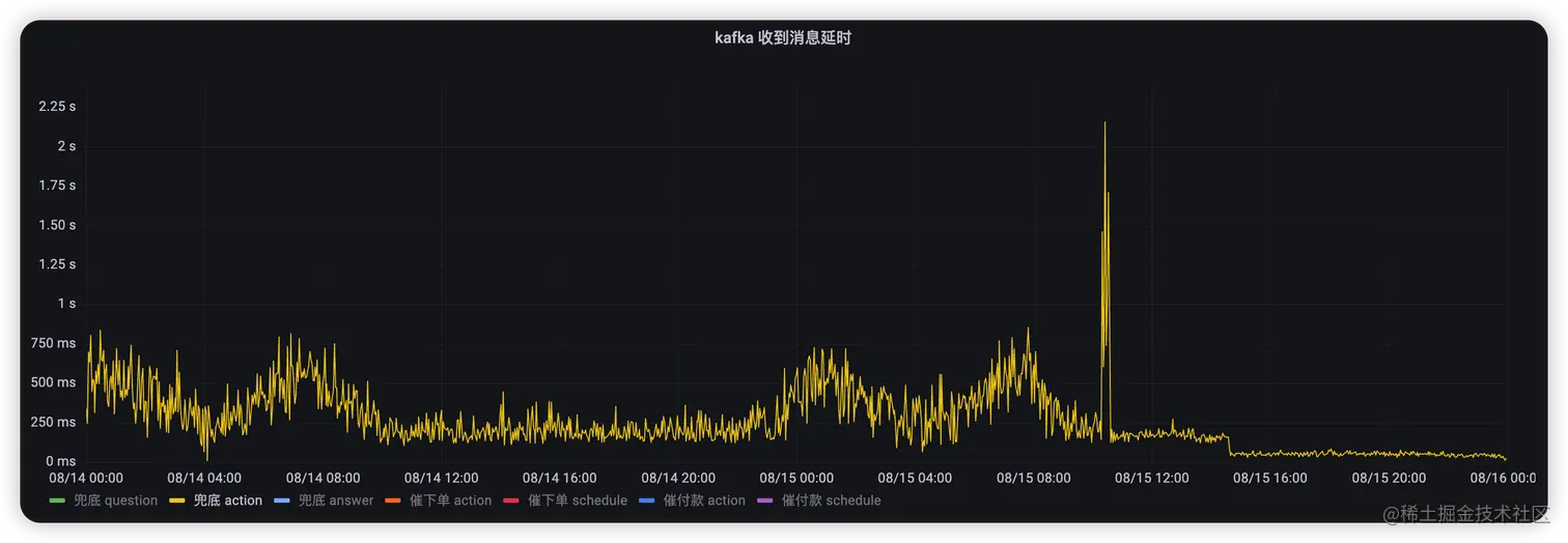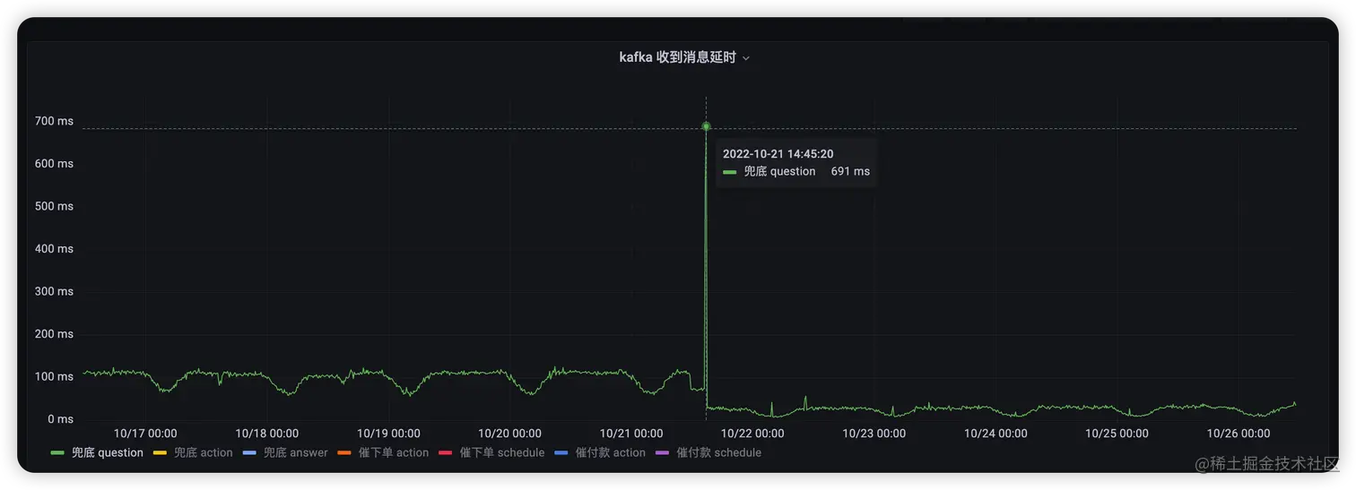 如下图所示,拼多多兜底 question 消费 dialogue-grpc-session-all-in-one-pdd的kafka 消息,之前的消费者收到消息延迟大约在 100 毫秒左右(消费者收到消息时间 - 生产者发出消息时间),经过调整消费者参数,延迟降低到了 25 毫秒左右