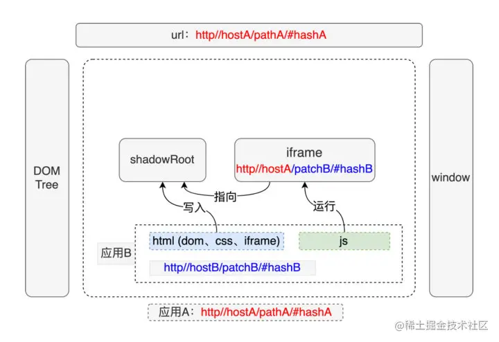 在应用A中构造一个shadow和iframe,然后将应用B的html写入shadow中,js运行在iframe中,注意iframe的url保持和主应用同域但是保留子应用的路径信息,这样子应用的js可以运行在iframe的location和history中保持路由正确。然后在iframe中拦截document对象,统一将dom指向shadowRoot,此时比如新建元素、弹窗或者冒泡组件就可以正常约束在shadowRoot内部。