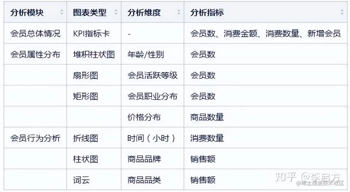 4、会员指标体系:根据会员总体情况、会员属性分布、会员行为分析三个模块建立会员指标体系。