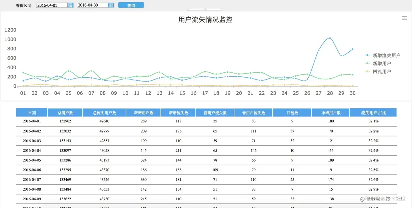 关于流失的常规数据监控,一般都是和存留一起的,本身两者也是分不开的。单独针对流失的,最多看到如下图样式的监控: