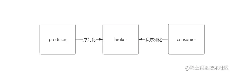 如下,kafka生产者在发送消息到broker之前需要序列化,消费者从broker获取消息后需要反序列化。