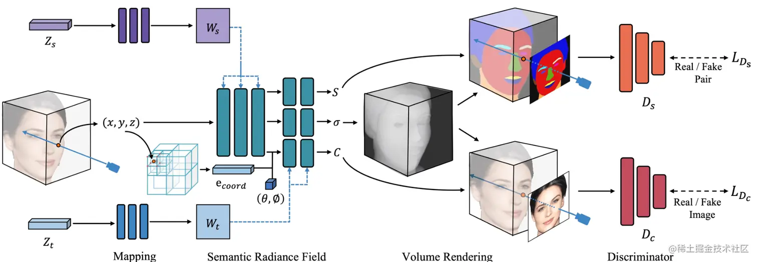 基于此,FENeRF提出了一种3D感知生成器,可以生成视图一致且可本地编辑的肖像图像。FENeRF使用两个解耦的潜在代码在具有共享几何结构的空间对齐的3D体积中生成相应的面部语义和纹理。得益于这种底层3D表示,Feneff可以联合渲染边界对齐的图像和语义掩模,并使用语义掩模通过GAN逆映射编辑3D体积。