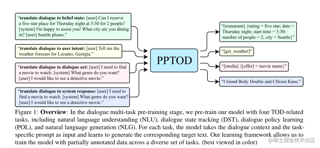 PPTOD模型将不同的对话模块(例如DST、POL和NLG)集成到一个统一的模型中。受上下文内学习概念(Brown et al, 2020)的激励,作者将特定于任务的自然语言指令(称为提示)插入对话上下文作为模型输入来引导模型解决不同的TOD子任务 , 这种方式上不同子任务的代数是解耦的,使得模型具有更大的灵活性,另外作者还使用T5对由部分注释数据组成的异构对话语料库进行了预训练。
