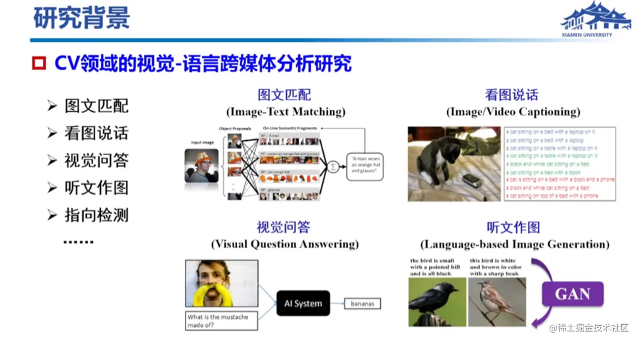 视觉-语言跨媒体分析研究是计算机视觉(CV)领域的重要研究方向之一,它将图像和视频中的视觉信息与自然语言中的语义信息相结合,通过计算机算法进行跨媒体的分析和理解。该领域的研究目标是建立视觉与语言之间的联系,实现计算机对图像、视频、语音等多模态数据的深入理解和处理,从而推进人工智能的发展和应用。在视觉-语言跨媒体分析研究中,深度学习技术和生成式模型被广泛应用,例如图文匹配、看图说话、视觉问答、听文作图和指向检测等,为实现智能化应用和人机交互提供了有力支撑。