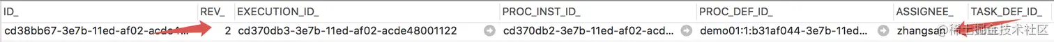 这行代码执行完成后,我们看数据库中的 ACT_RU_TASK 表,还是刚才那条记录,但是处理人变了,变成了 zhangsan: