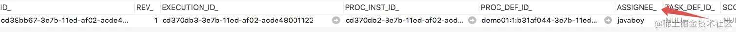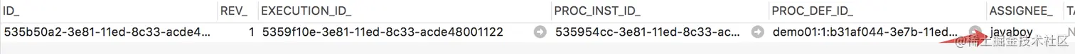 接下来,我们部署并启动这个流程(具体的部署启动方式可以参考本系列之前的文章),启动之后,我们可以在数据库的 ACT_RU_TASK 表中看到,这个 UserTask 的处理人是 javaboy,如下图: