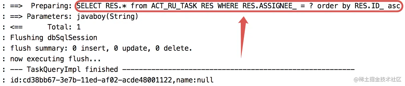 这个查询,本质上其实就是去 ACT_RU_TASK 表中查询的,我们来看看执行的 SQL:
