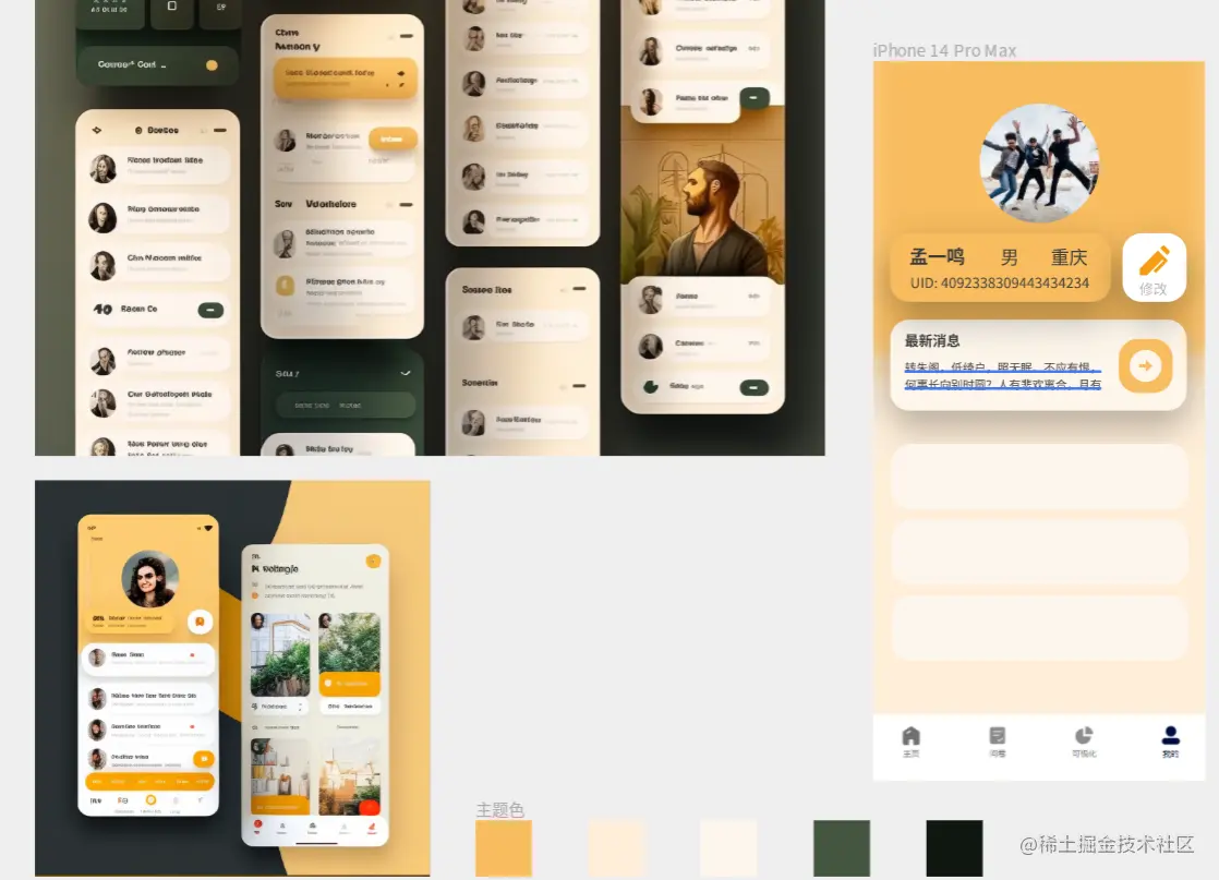 到此为止,基本上有一个可以供设计参考的UI设计稿了,整体风格我们就可以参考这些不同的页面。但是,如果我们想要设计其中一个页面的详情呢,比如一个个人主页这些页面中就没有包含,所以我们如果想继续设计,就还是得继续去问AI