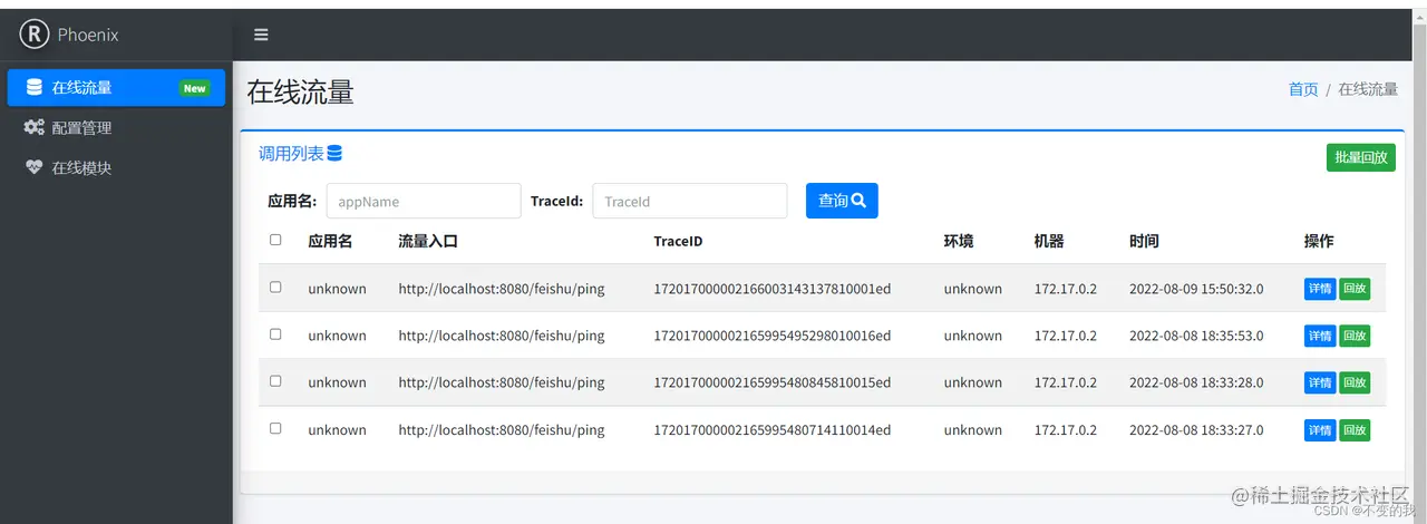 在线流量:当repeater-service开启侦测后,会按照配置管理中的录取规则,进行流量录制并回传到console中,用户可以进行单条回放或者批量回放,并查看回放结果。