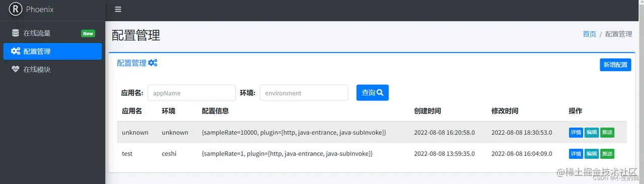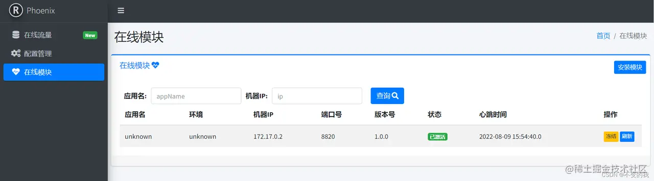 在线模块:可以理解成被侦测的应用实例地址,这里可以手动添加或者冻结。