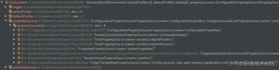 下图给出了 SpringApplication#prepareEnvironment 方法执行完后 Environment 的详细信息。