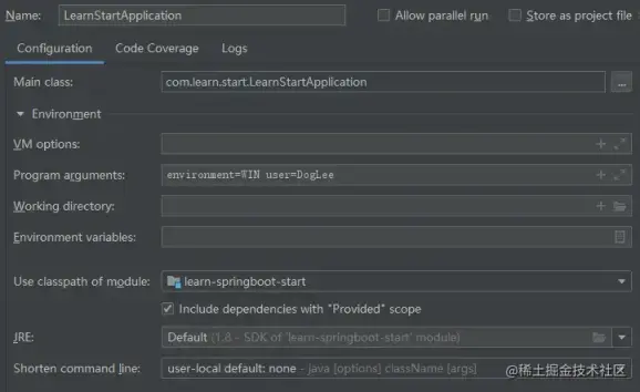 启动程序时通过命令行指定的应用程序参数(args)会被先创建为 DefaultApplicationArguments 对象,然后再被解析为 SimpleCommandLinePropertySource,例如通过 IDEA 进行如下配置。