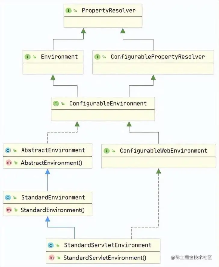 - 首先会根据初始化 SpringApplication 时推断出来的 WEB 应用程序类型创建不同的 Environment,例如 WEB 应用程序类型为 SERVLET 时,创建的 Environment 的实际类型为 StandardServletEnvironment;