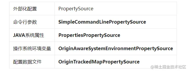 可见 Environment 的实际类型为 StandardServletEnvironment,这是和 Springboot 的应用程序类型挂钩,这点后面再说。StandardServletEnvironment 内部持有一个 MutablePropertySources 对象,该对象持有一个 PropertySource 的集合,Springboot 加载的每一种外部化配置都会最终被解析为一个 PropertySource 的实现类并存放在 MutablePropertySources 的 PropertySource 集合中,PropertySource 就是每一种外部化配置源在 Springboot 中的体现,其提供了对外部化配置的各种操作。根据上图为例,给出一部分外部化配置源与 PropertySource 的实现类的对应关系。