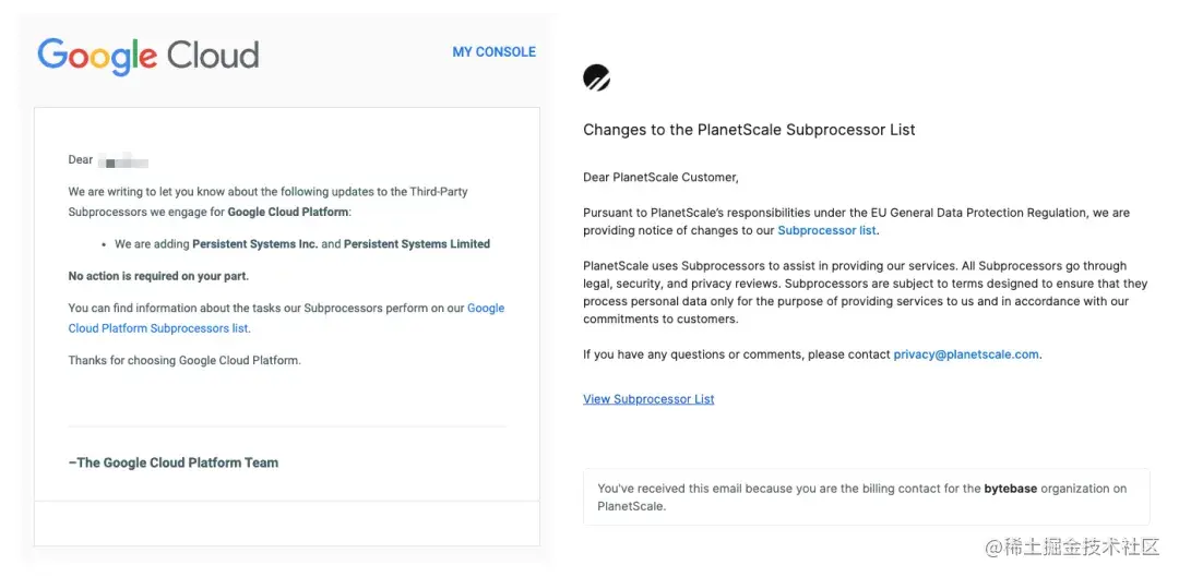 云服务供应商会聘请第三方服务提供商协助提供服务,因为这些服务提供商可能会使用到用户个人数据,为帮助用户了解谁可以访问和使用其个人数据以及对于一些地区的保护数据法规的遵循,云服务商需要公布并定期更新子处理者名单(Subprocessor List)。人话:比如 PlanetScale 用 Stripe 给用户发账单,Stripe 就会出现在 PlanetScale 的子处理者名单上。