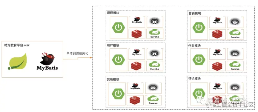 一个业务系统,原本是在一个独立的 war 包中。现在为了更好的维护和提高性能,把这个 war 包按照业务纬度拆分成了一个个独立的业务子系统,每个子系统提供该业务领域相关的功能,并暴露 API 接口。