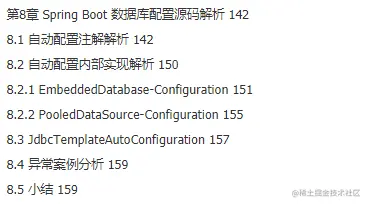 本章重点介绍了 DataSourceAutoConfiguration 类和 Jdbc TemplateAutoConfiguration 类的 自 动 配置。 关于数据库的自动配置还有很多相关配置和功能实现 , 比 如 JndiDataSource-AutoConfiguration 、 XADataSourceAutoConfiguration 、 DataSourceTransactionManagerAuto-Configuration 等, 感兴趣的朋友可以按照本章介绍的方法和思路进行源码的学习。