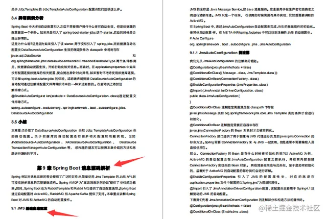 本章重点分析了 Spring Boot 中 JMS 和 ActiveMQ 的自动配置。ActiveMQ 很 好地实现了 JMS 协议,同时又可以很方便地进行定制化实现。针对 JMS 的注解部分,Spring Boot 也提供了专门的自动配置类 JmsAnnotationDrivenConfiguration 进行一系列的默认配置。