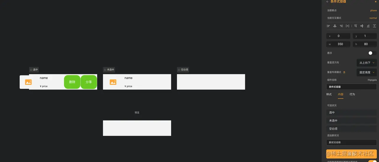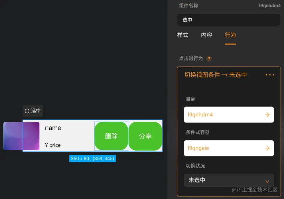 优化 这时你已经完成大半了,你可以预览试一下,发现点击了后能出现侧边框,但是再点击回不去 接下来就是选中之后的点击时行为选择切换试图条件到未选中试图。