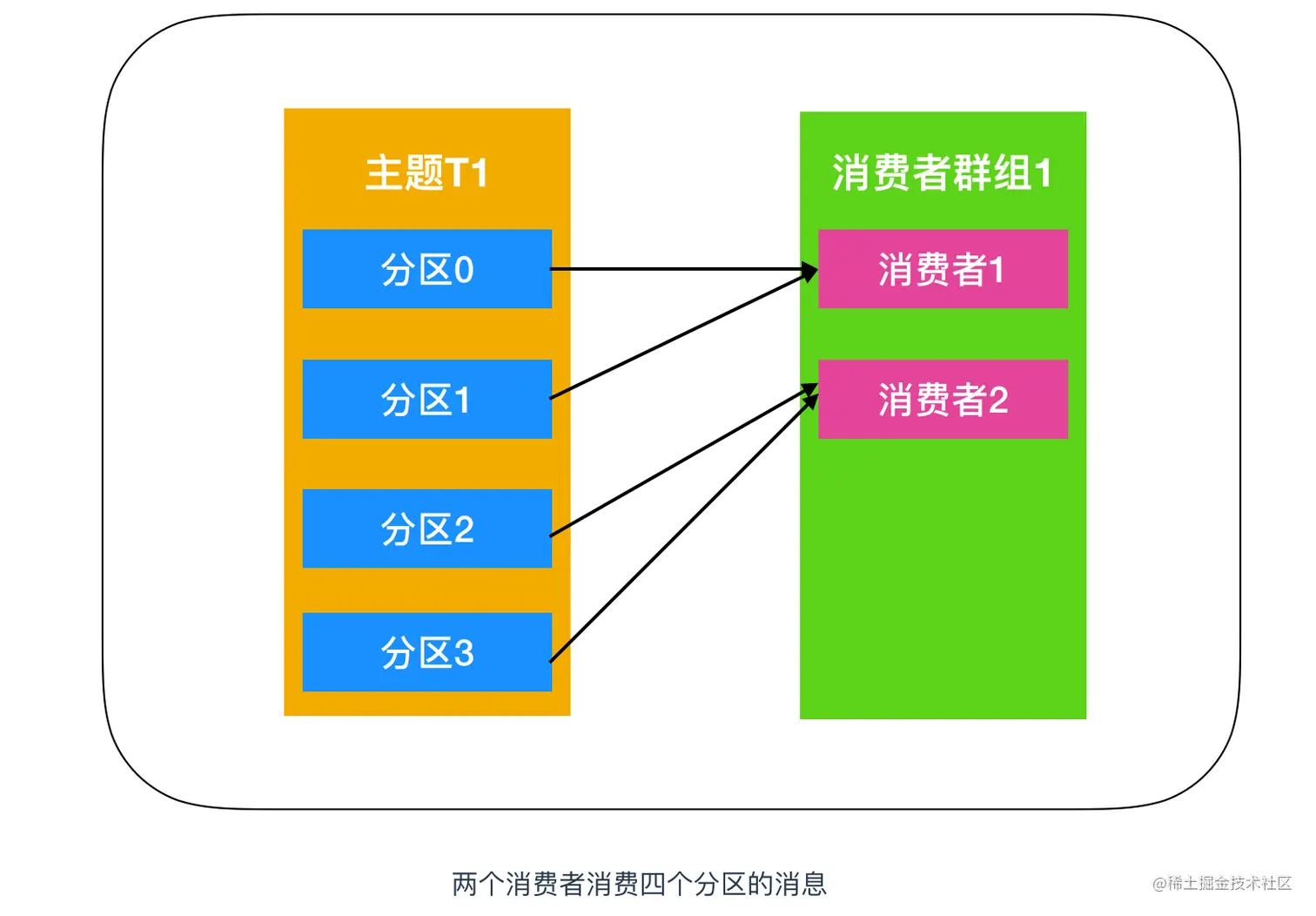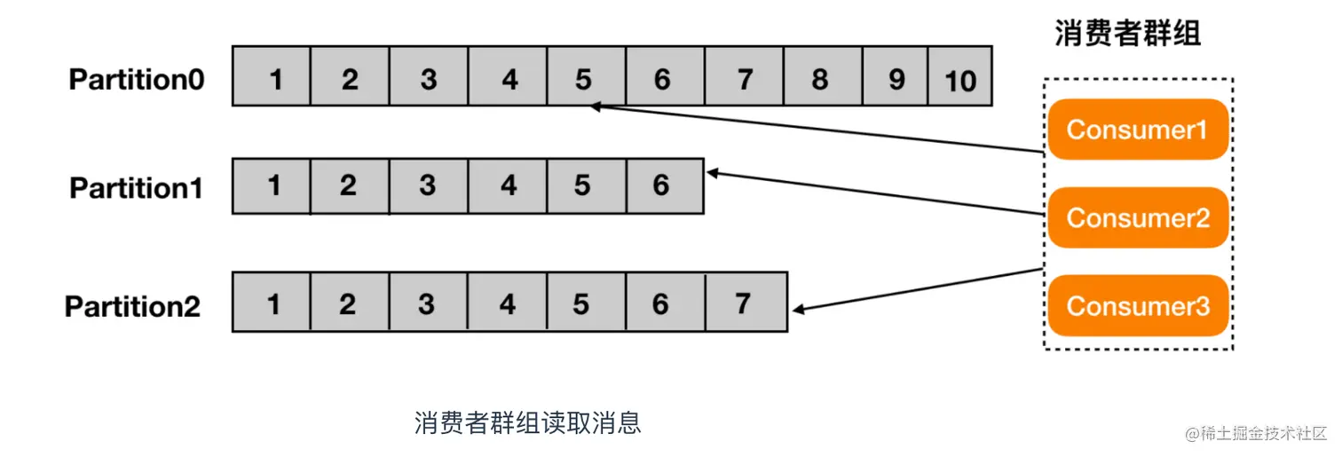 Kafka消费者从属于消费者群组。一个群组中的消费者订阅的都是相同的主题,每个消费者接收主题一部分分区的消息。下面是一个Kafka分区消费示意图