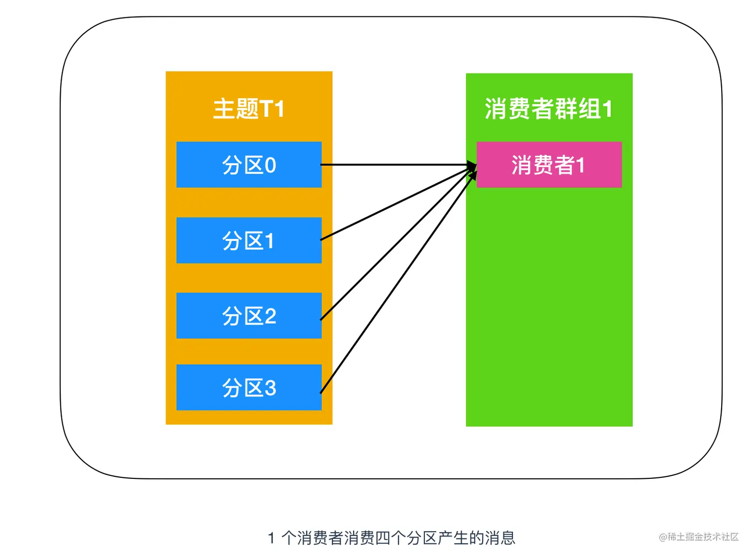 上图中的主题 T1 有四个分区,分别是分区0、分区1、分区2、分区3,我们创建一个消费者群组1,消费者群组中只有一个消费者,它订阅主题T1,接收到 T1 中的全部消息。由于一个消费者处理四个生产者发送到分区的消息,压力有些大,需要帮手来帮忙分担任务,于是就演变为下图