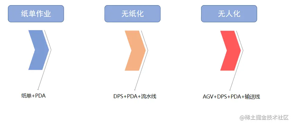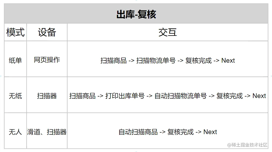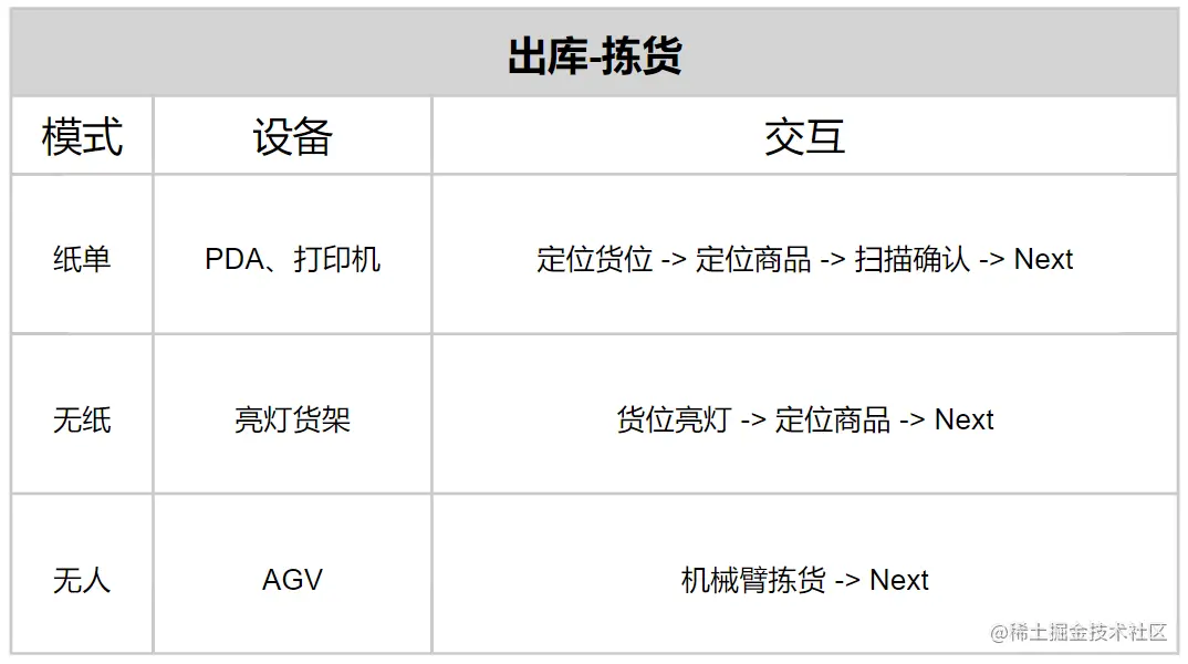 出库业务指的是商品执行出库发货任务并扣减库存的流程,其人工操作主要流程:拣货 -> 播种 -> 复核;对于这三个节点我们分别增加了对应的自动化设备,下面是不同模式下的对比: