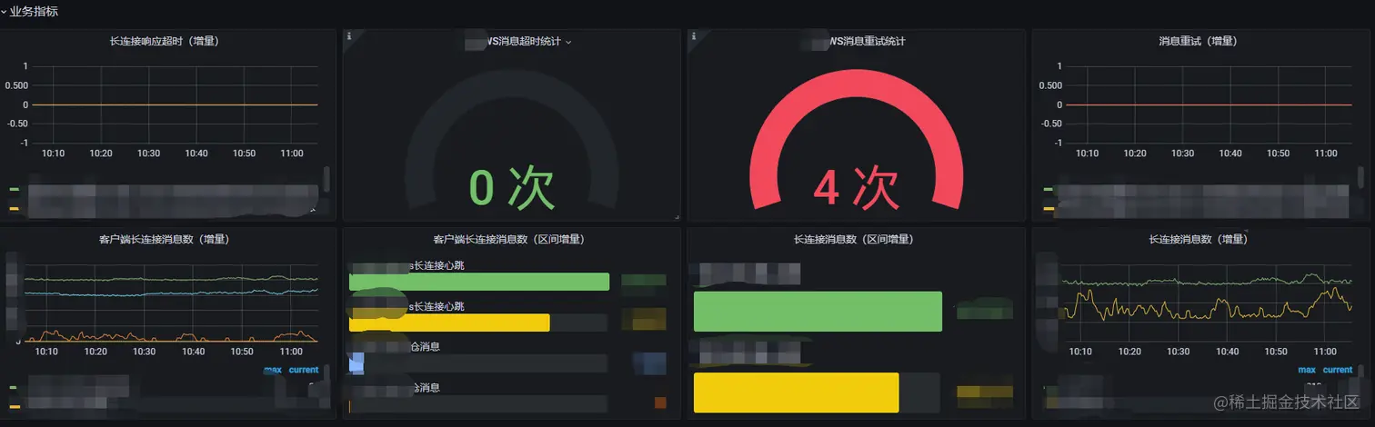 WebSocket长连接客户端监控页面如下图,该页面能对所有WebSocket长连接客户端进行实时状态的监控以及实时硬件配置。 WebSocket长连接消息监控页面如下,在接入公司Prometheus监控体系后,可以对WebSocket长连接的消息丢失量、消息重试数等指标进行实时监控预警。