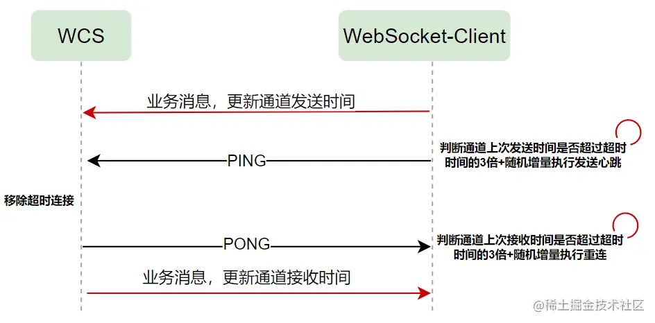 - WebSocket心跳重连实现;连接通道空闲定时心跳,超时重连。如下图: