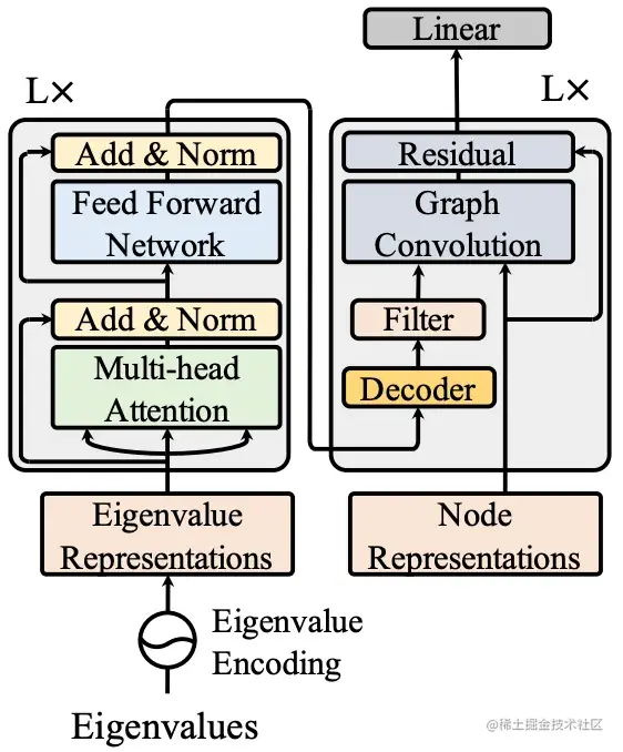 将Transformer作为编码器对特征值表示进行学习后,解码器可以解码出新的特征值进行滤波。最近的研究表明,为每个特征维度分配一个独立的滤波器可以提高图神经网络的性能。受这一发现的启发,我们的解码器首先解码出几个基滤波器,然后使用神经网络组合这些基以构建最终的图卷积。