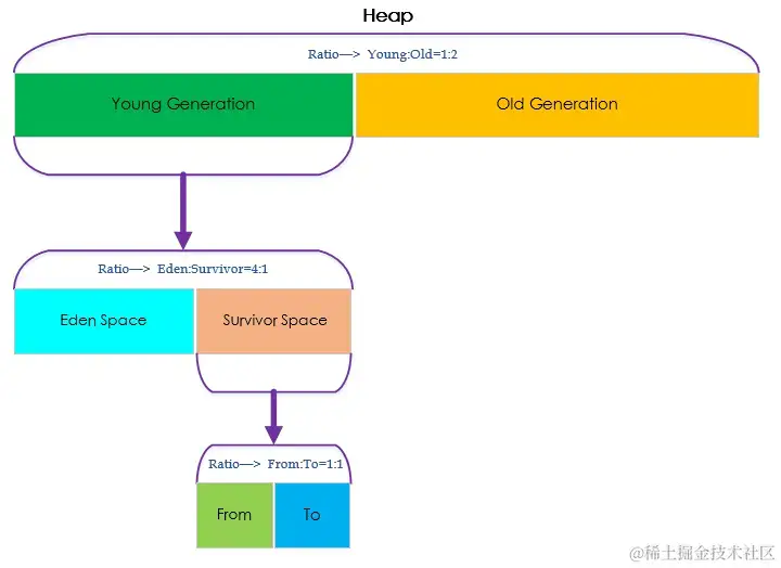 默认情况下,Heap中占比情况是:Young Generation:Old Generation=1:2;新生代Young Generation中占比情况是:Eden Space:From Survivor:To Survivor=8:1:1 。