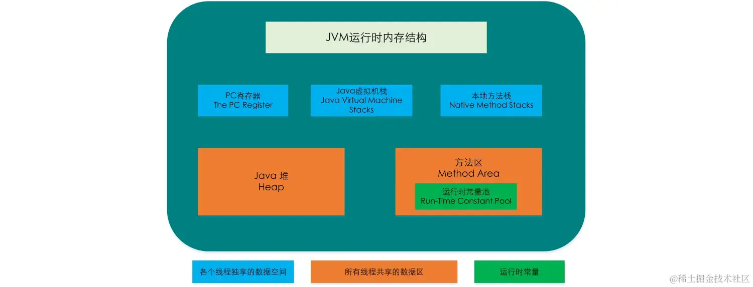 Method Area(方法区)是各个线程共享的内存区域方法区,又称Non-Heap(非堆),用于存储已被虚拟机加载的类信息、方法、常量、静态成员变量、JIT(即时编译器)编译后的代码等数据,在类加载时分配。