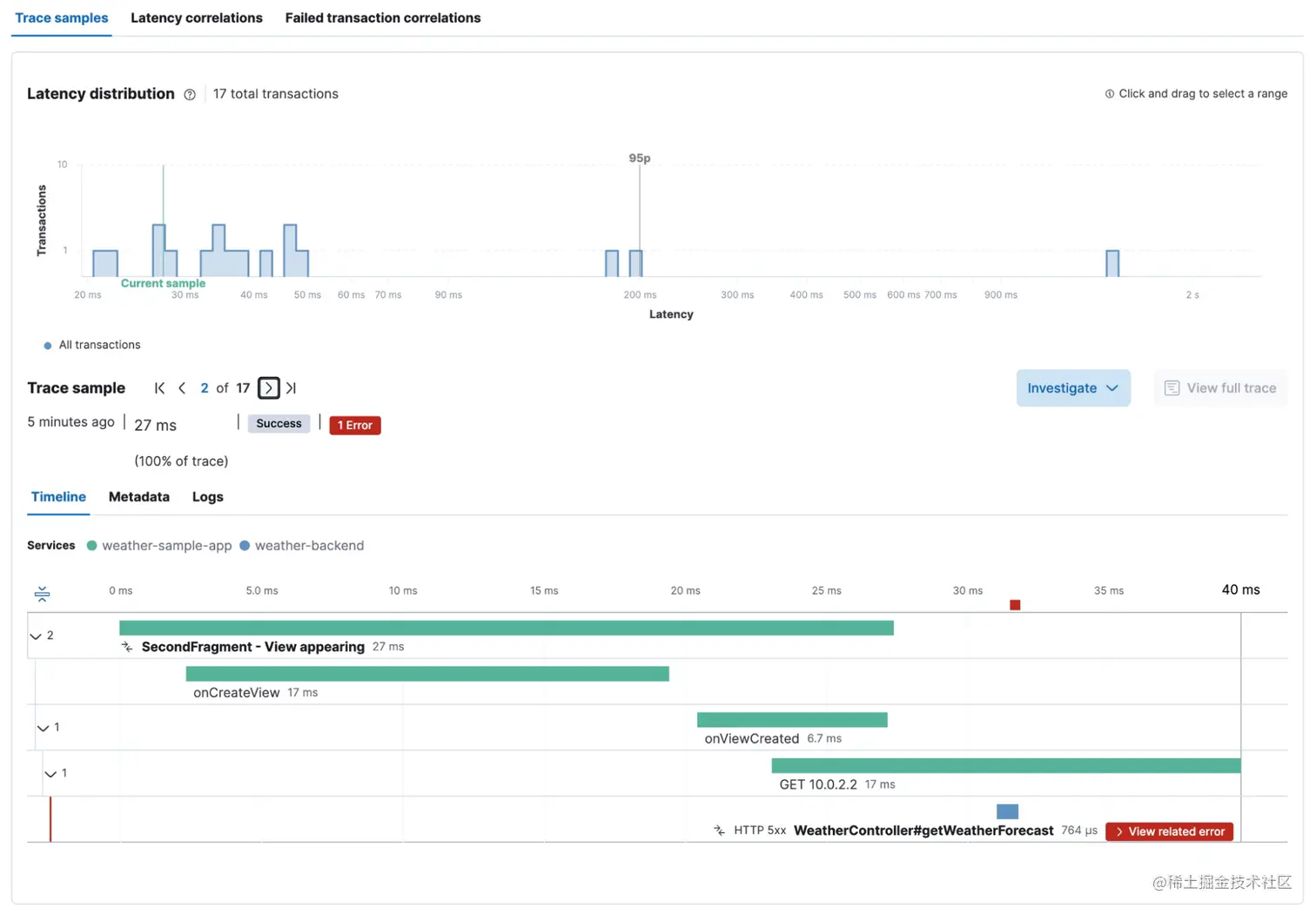 让我们深入研究 SecondFragment - 查看出现的 transaction,以查看此 transaction 组的指标(例如,延迟、吞吐量)以及单个用户交互的调用瀑布视图。 正如我们在下面的屏幕截图中看到的,在视图创建之后,该片段向 10.0.2.2 执行 HTTP GET 请求,这需要大约 130 毫秒。 在同一个瀑布中,我们看到 HTTP 调用由 weather-backend 服务处理,它本身对 api.open-meteo.com 进行 HTTP 调用。