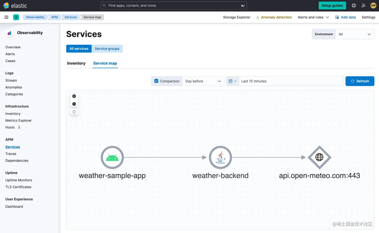 在 Services 导航项下,你应该看到两个服务的列表:我们的 Android 应用 weather-sample-app 和相应的后端服务 weather-backend。 单击 Service map 选项卡以查看这些服务与任何外部服务之间依赖关系的可视化。