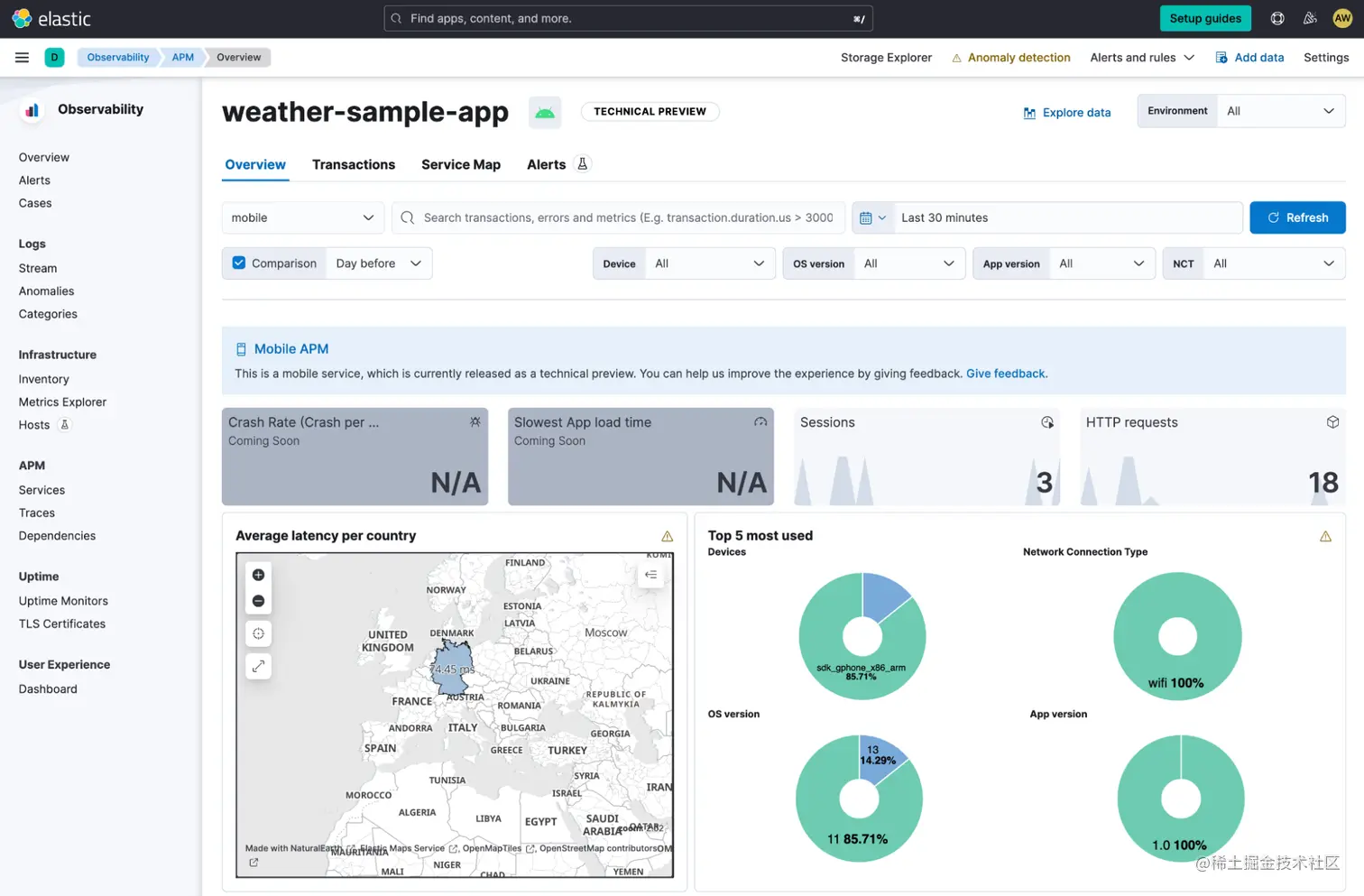 单击 weather-sample-app 以深入了解 Android 应用程序的仪表板。 移动应用程序的服务视图在发布此博文时处于技术预览(technical preview)阶段,但你已经可以在该屏幕上看到有关该应用程序的深入信息。 你会看到所选时间范围内的活动会话数量、weather-sample-app 发出的 HTTP 请求数量、请求的地理分布以及设备型号、操作系统版本、网络连接类型和应用程序的细分等信息 版本。 (有关崩溃和应用程序加载时间的信息正在开发中。)